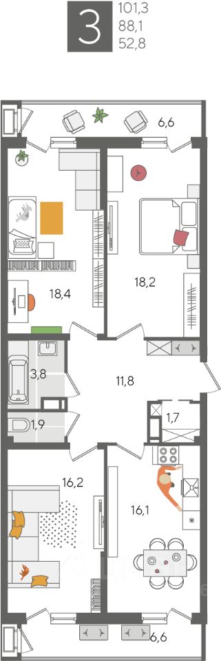 В продаже 3-комнатная квартира от застройщика! ЖК "Рекорд" 2 очередь, г. Краснодар, Литер 2 Срок сдачи: 4 кв. 2026, общей площадью 101.3 кв.м., на 13 этаже.