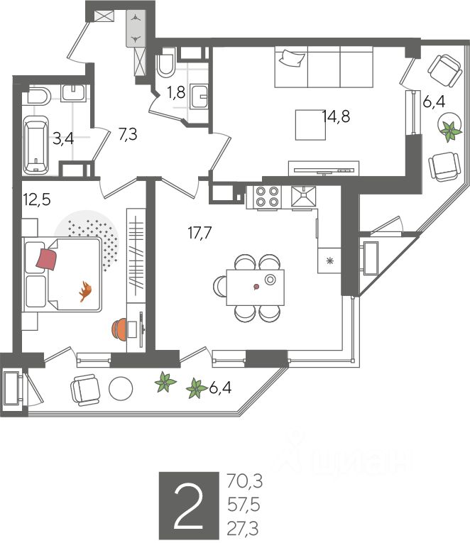 В продаже 2-комнатная квартира от застройщика! ЖК "Рекорд" 2 очередь, г. Краснодар, Литер 2 Срок сдачи: 4 кв. 2026, общей площадью 70.3 кв.м., на 16 этаже.