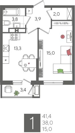 В продаже 1-комнатная квартира от застройщика! ЖК "Рекорд" 2 очередь, г. Краснодар, Литер 2 Срок сдачи: 4 кв. 2026, общей площадью 41.4 кв.м., на 19 этаже.
