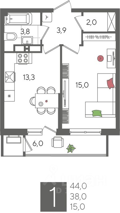 В продаже 1-комнатная квартира от застройщика! ЖК "Рекорд" 2 очередь, г. Краснодар, Литер 2 Срок сдачи: 4 кв. 2026, общей площадью 44 кв.м., на 22 этаже.