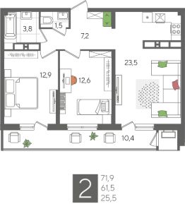 В продаже 2-комнатная квартира от застройщика! ЖК "Рекорд" 2 очередь, г. Краснодар, Литер 2 Срок сдачи: 4 кв. 2026, общей площадью 71.9 кв.м., на 24 этаже.