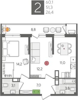 В продаже 2-комнатная квартира от застройщика! ЖК "Рекорд" 2 очередь, г. Краснодар, Литер 2 Срок сдачи: 4 кв. 2026, общей площадью 60.1 кв.м., на 24 этаже.