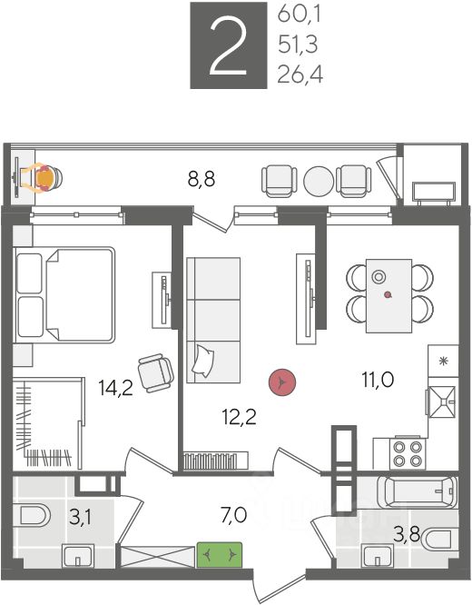 В продаже 2-к квартира от застройщика! ЖК "Рекорд" 2 очередь, г. Краснодар, Литер 2. Срок сдачи: 2 кв. 2026, общей площадью 60.1 кв.м., на 24 этаже.