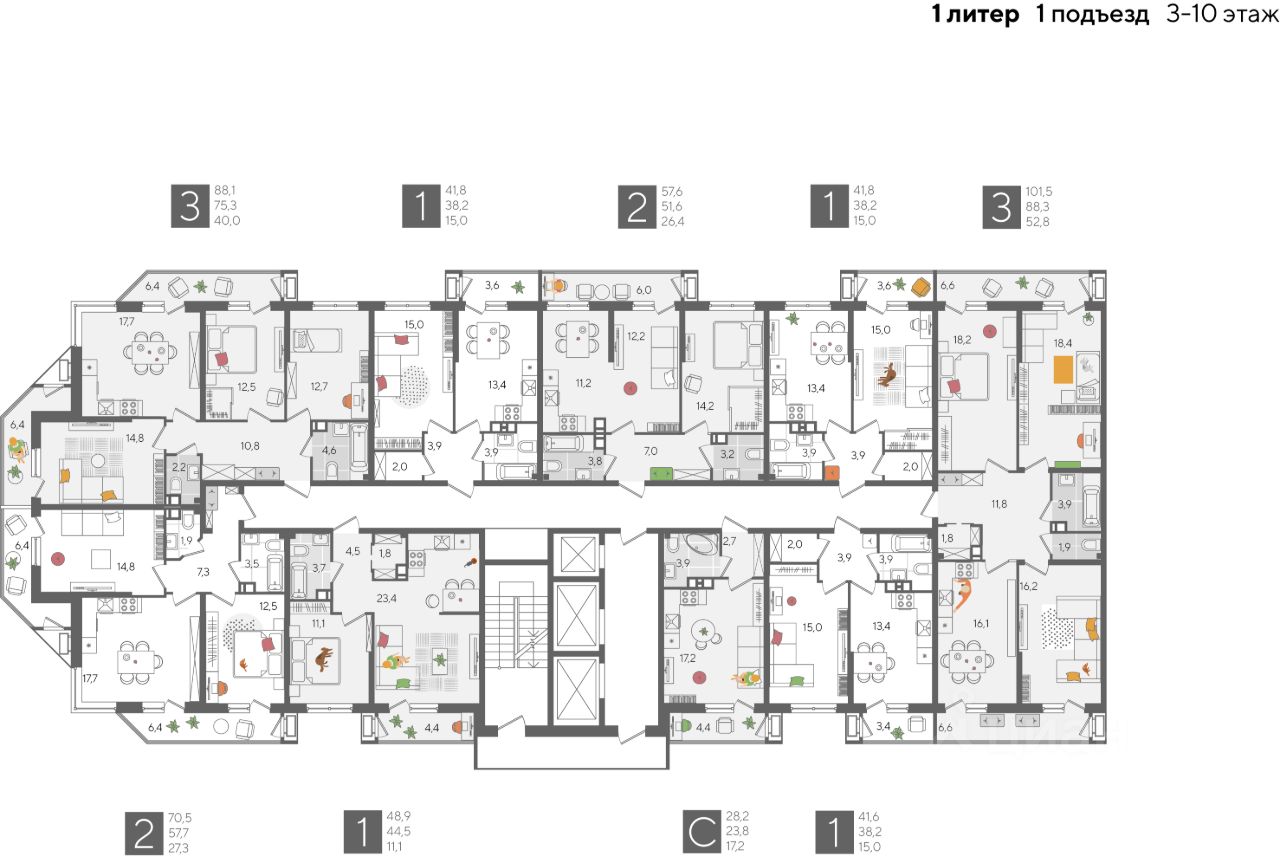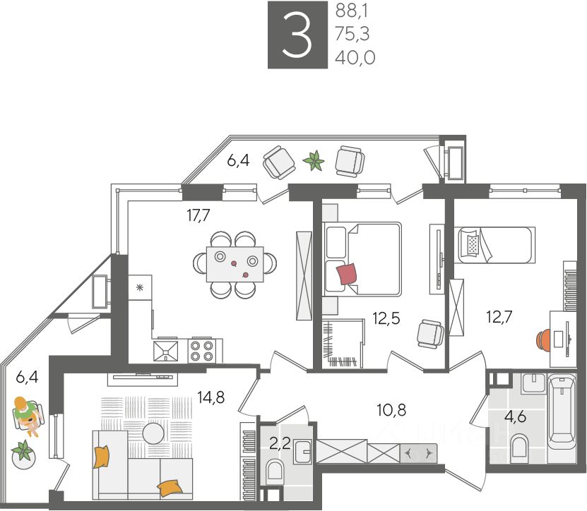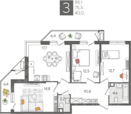 В продаже 3-комнатная квартира от застройщика! ЖК "Рекорд" 2 очередь, г. Краснодар, Литер 1 Срок сдачи: 4 кв. 2026, общей площадью 88.1 кв.м., на 3 этаже.