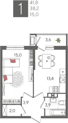 В продаже 1-комнатная квартира от застройщика! ЖК "Рекорд" 2 очередь, г. Краснодар, Литер 1 Срок сдачи: 4 кв. 2026, общей площадью 41.8 кв.м., на 3 этаже.