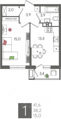 В продаже 1-комнатная квартира от застройщика! ЖК "Рекорд" 2 очередь, г. Краснодар, Литер 1 Срок сдачи: 4 кв. 2026, общей площадью 41.6 кв.м., на 9 этаже.