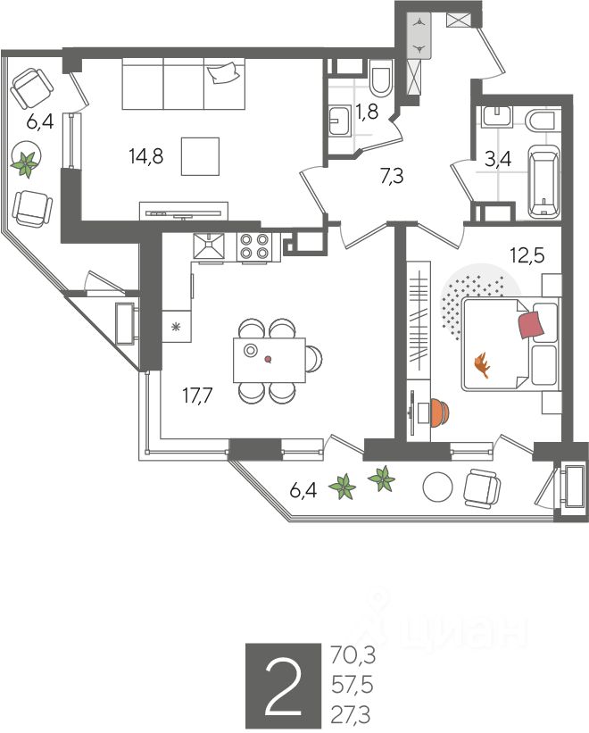 В продаже 2-комнатная квартира от застройщика! ЖК "Рекорд" 2 очередь, г. Краснодар, Литер 1 Срок сдачи: 4 кв. 2026, общей площадью 70.3 кв.м., на 19 этаже.