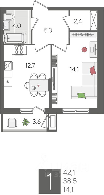 В продаже 1-комнатная квартира от застройщика! ЖК "Рекорд" 2 очередь, г. Краснодар, Литер 1 Срок сдачи: 4 кв. 2026, общей площадью 42.1 кв.м., на 2 этаже.