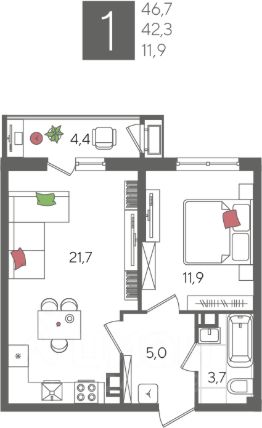 В продаже 1-комнатная квартира от застройщика! ЖК "Рекорд" 2 очередь, г. Краснодар, Литер 1 Срок сдачи: 4 кв. 2026, общей площадью 46.7 кв.м., на 3 этаже.