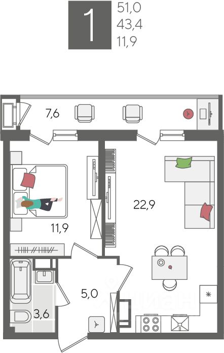 В продаже 1-комнатная квартира от застройщика! ЖК "Рекорд" 2 очередь, г. Краснодар, Литер 1 Срок сдачи: 4 кв. 2026, общей площадью 51 кв.м., на 15 этаже.