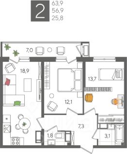 В продаже 2-комнатная квартира от застройщика! ЖК "Рекорд" 2 очередь, г. Краснодар, Литер 1 Срок сдачи: 4 кв. 2026, общей площадью 63.9 кв.м., на 19 этаже.