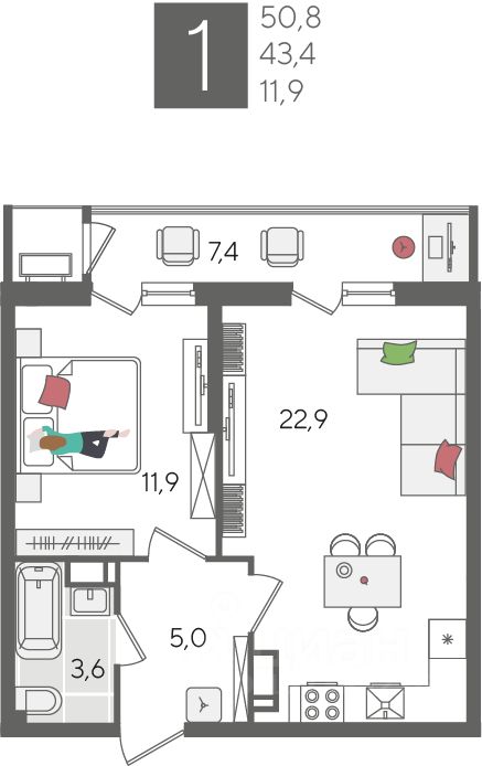 В продаже 1-комнатная квартира от застройщика! ЖК "Рекорд" 2 очередь, г. Краснодар, Литер 1 Срок сдачи: 4 кв. 2026, общей площадью 50.8 кв.м., на 23 этаже.