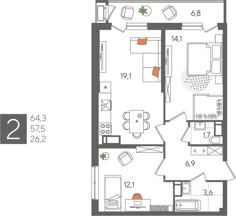 В продаже 2-комнатная квартира от застройщика! ЖК "Рекорд" 2 очередь, г. Краснодар, Литер 1 Срок сдачи: 4 кв. 2026, общей площадью 64.3 кв.м., на 23 этаже.