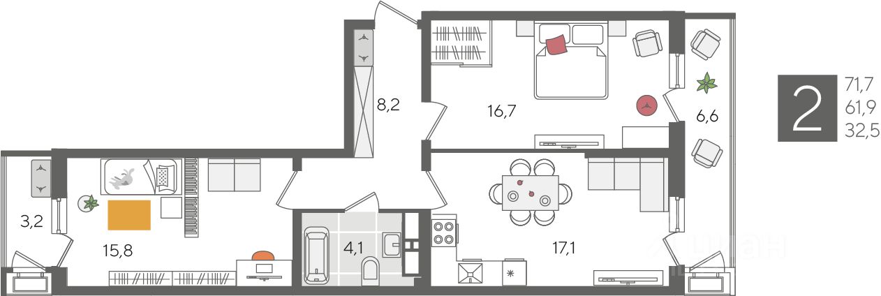 В продаже 2-комнатная квартира от застройщика! ЖК "Рекорд" 2 очередь, г. Краснодар, Литер 1 Срок сдачи: 4 кв. 2026, общей площадью 71.7 кв.м., на 24 этаже.