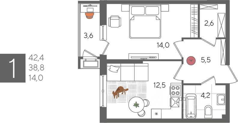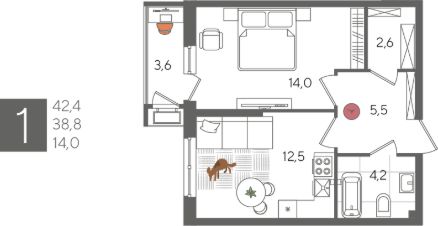 В продаже 1-комнатная квартира от застройщика! ЖК "Рекорд" 2 очередь, г. Краснодар, Литер 1 Срок сдачи: 4 кв. 2026, общей площадью 42.4 кв.м., на 2 этаже.
