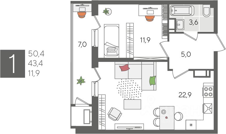 В продаже 1-комнатная квартира от застройщика! ЖК "Рекорд" 2 очередь, г. Краснодар, Литер 1 Срок сдачи: 4 кв. 2026, общей площадью 50.4 кв.м., на 24 этаже.