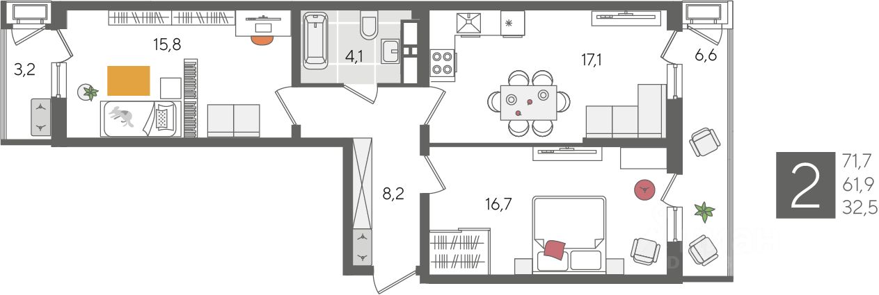 В продаже 2-комнатная квартира от застройщика! ЖК "Рекорд" 2 очередь, г. Краснодар, Литер 1 Срок сдачи: 4 кв. 2026, общей площадью 71.7 кв.м., на 24 этаже.