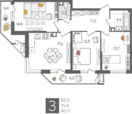 В продаже 3-комнатная квартира от застройщика! ЖК "Рекорд" 2 очередь, г. Краснодар, Литер 1 Срок сдачи: 4 кв. 2026, общей площадью 88 кв.м., на 6 этаже.