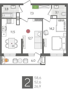 В продаже 2-комнатная квартира от застройщика! ЖК "Рекорд" 2 очередь, г. Краснодар, Литер 1 Срок сдачи: 4 кв. 2026, общей площадью 58.6 кв.м., на 16 этаже.