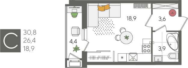 В продаже квартира-студия от застройщика! ЖК "Рекорд" 2 очередь, г. Краснодар, Литер 4 Срок сдачи: 4 кв. 2026, общей площадью 30.8 кв.м., на 2 этаже.