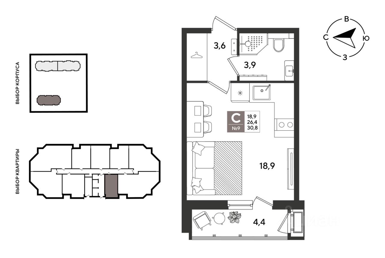 В продаже студия от застройщика! ЖК "Рекорд" 2 очередь, г. Краснодар, Литер 4. Срок сдачи: 2 кв. 2026, общей площадью 30.8 кв.м., на 2 этаже.