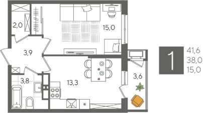 В продаже 1-комнатная квартира от застройщика! ЖК "Рекорд" 2 очередь, г. Краснодар, Литер 4 Срок сдачи: 4 кв. 2026, общей площадью 41.6 кв.м., на 16 этаже.