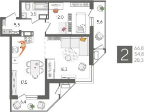 В продаже 2-комнатная квартира от застройщика! ЖК "Рекорд" 2 очередь, г. Краснодар, Литер 4 Срок сдачи: 4 кв. 2026, общей площадью 66.8 кв.м., на 22 этаже.
