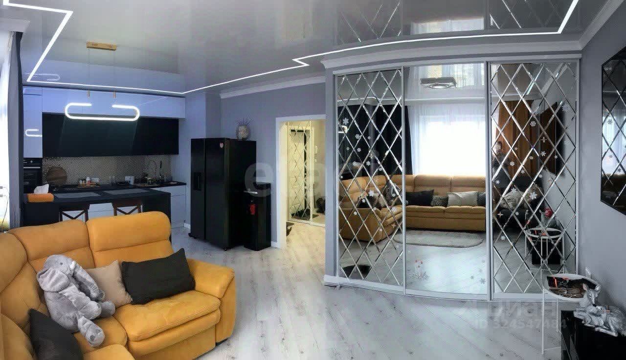 Особое настроение создаёт атмосферная RGВ-подсветка на потолке в гостиной, управляется с пульта, множество режимов и смена цветов под любое настроение — от уютных вечеров до весёлых встреч с друзьями.