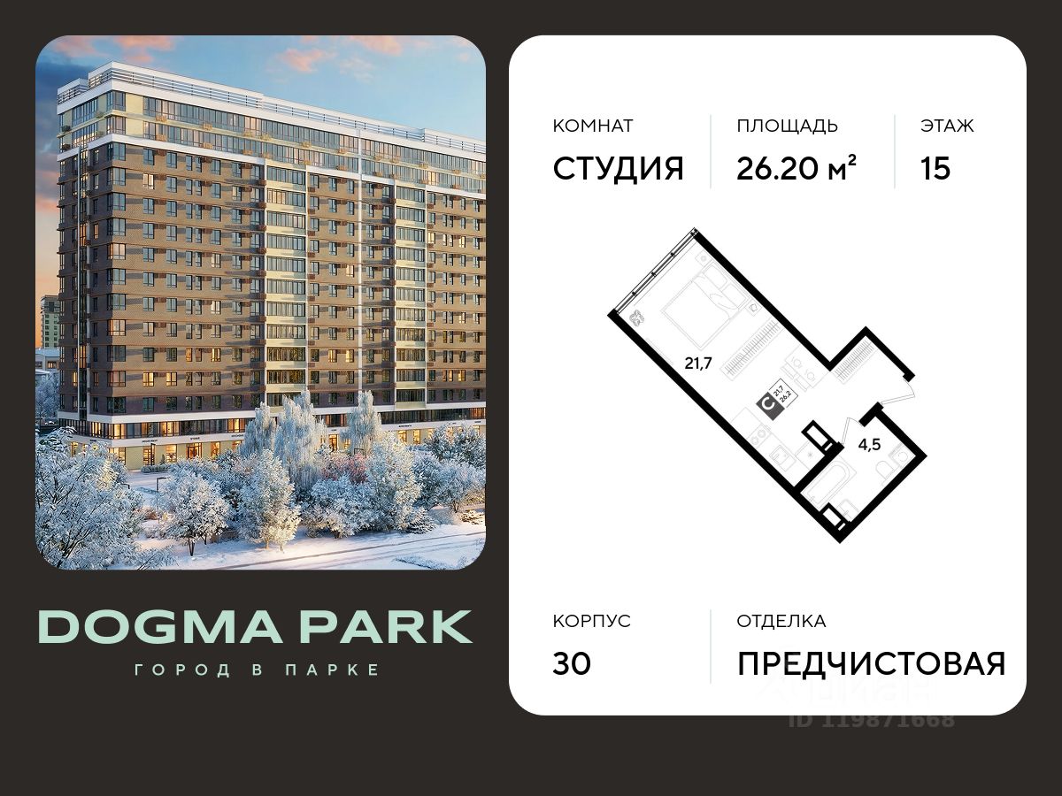 В продаже квартира-студия от застройщика! Мкр. "ДОГМА ПАРК" г. Краснодар, Литер 30 Срок сдачи: 2 кв. 2027, общей площадью 26.20 кв.м., на 15 этаже.