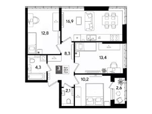 В продаже 3-комнатная квартира от застройщика! Мкр. "DOGMA PARK" г. Краснодар, Литер 23 Срок сдачи: 4 кв. 2027, общей площадью 70.6 кв.м., на 2 этаже.