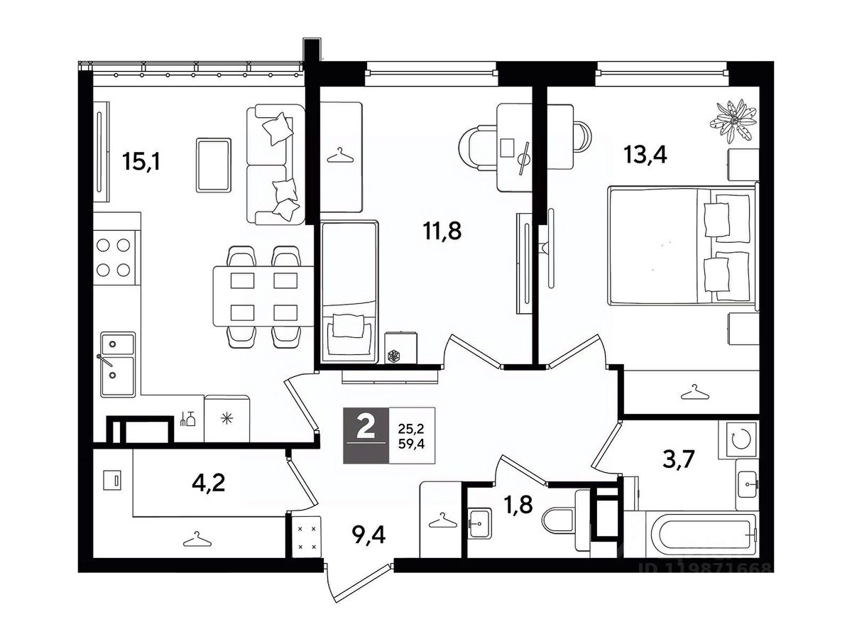 В продаже 2-комнатная квартира от застройщика! Мкр. "DOGMA PARK" г. Краснодар, Литер 23 Срок сдачи: 4 кв. 2027, общей площадью 59.4 кв.м., на 13 этаже.
