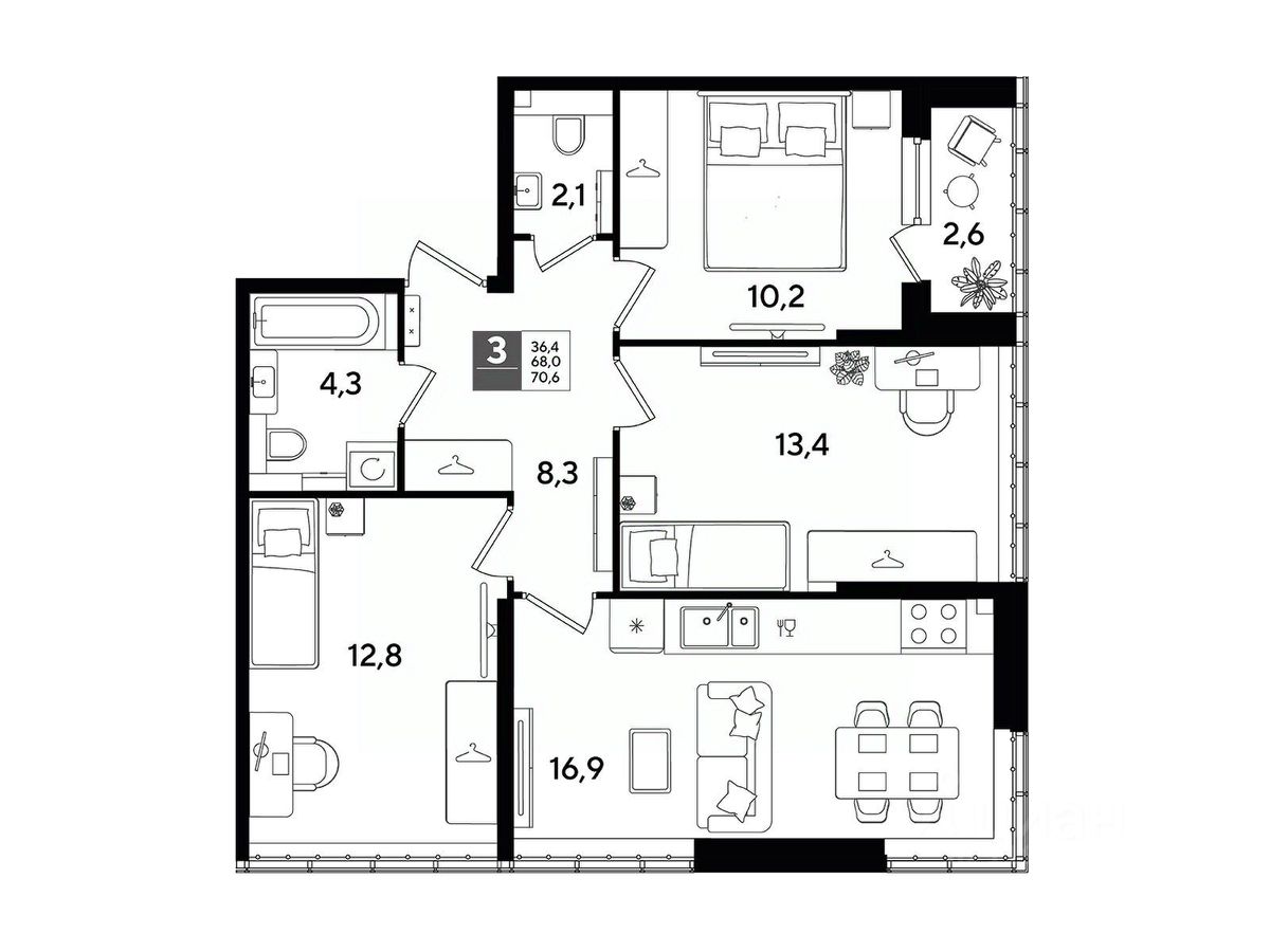 В продаже 3-комнатная квартира от застройщика! Мкр. "DOGMA PARK" г. Краснодар, Литер 25 Срок сдачи: 4 кв. 2027, общей площадью 70.6 кв.м., на 2 этаже.
