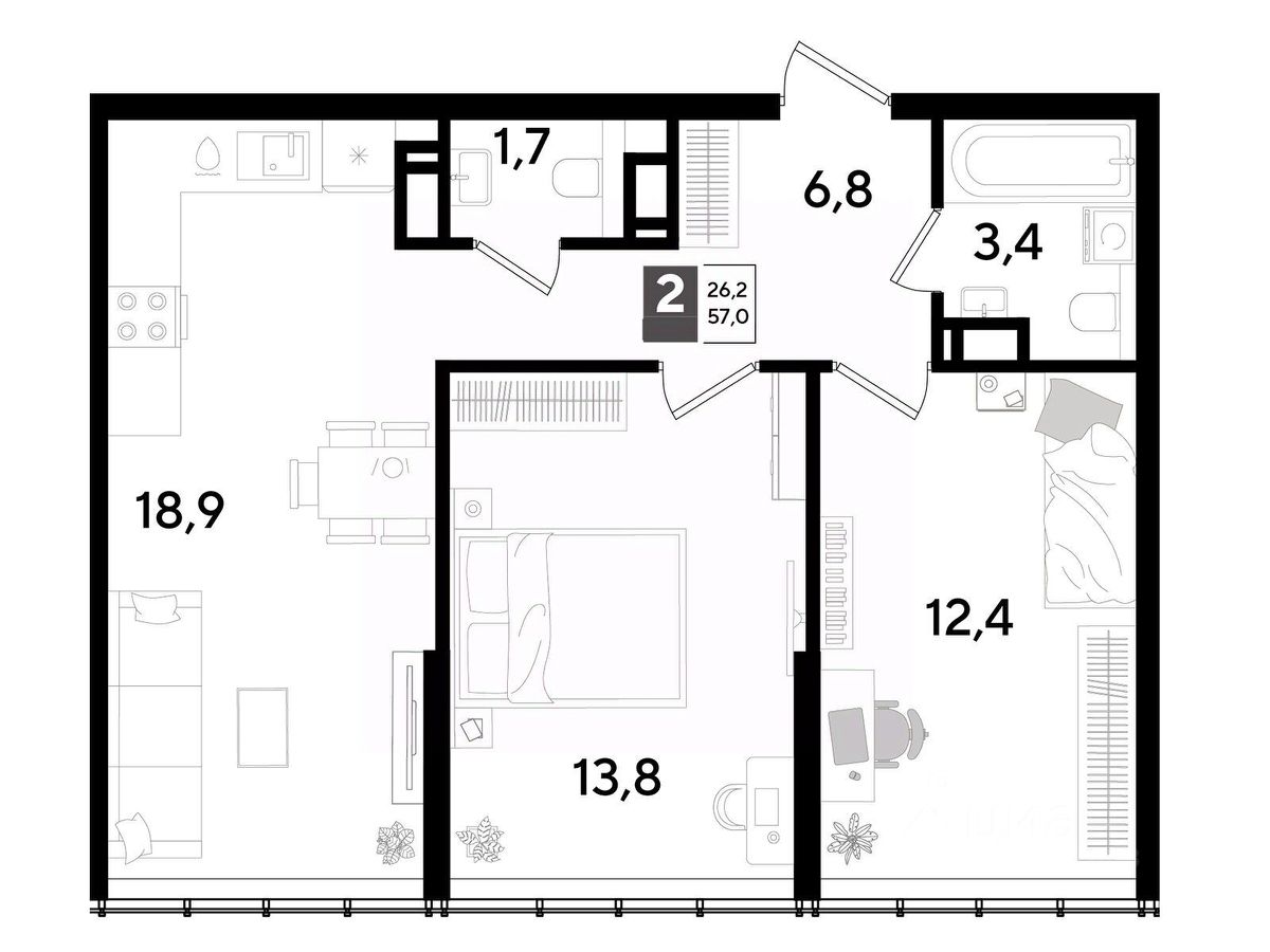 В продаже 2-комнатная квартира от застройщика! Мкр. "DOGMA PARK" г. Краснодар, Литер 36 Срок сдачи: 4 кв. 2027, общей площадью 57 кв.м., на 15 этаже.