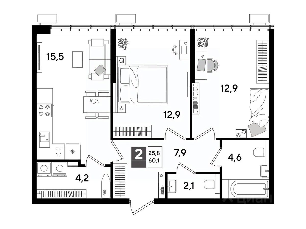 В продаже 2-комнатная квартира от застройщика! Мкр. "DOGMA PARK" г. Краснодар, Литер 34 Срок сдачи: 4 кв. 2027, общей площадью 60.1 кв.м., на 2 этаже.