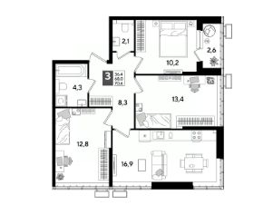 В продаже 3-комнатная квартира от застройщика! Мкр. "DOGMA PARK" г. Краснодар, Литер 34 Срок сдачи: 4 кв. 2027, общей площадью 70.6 кв.м., на 2 этаже.