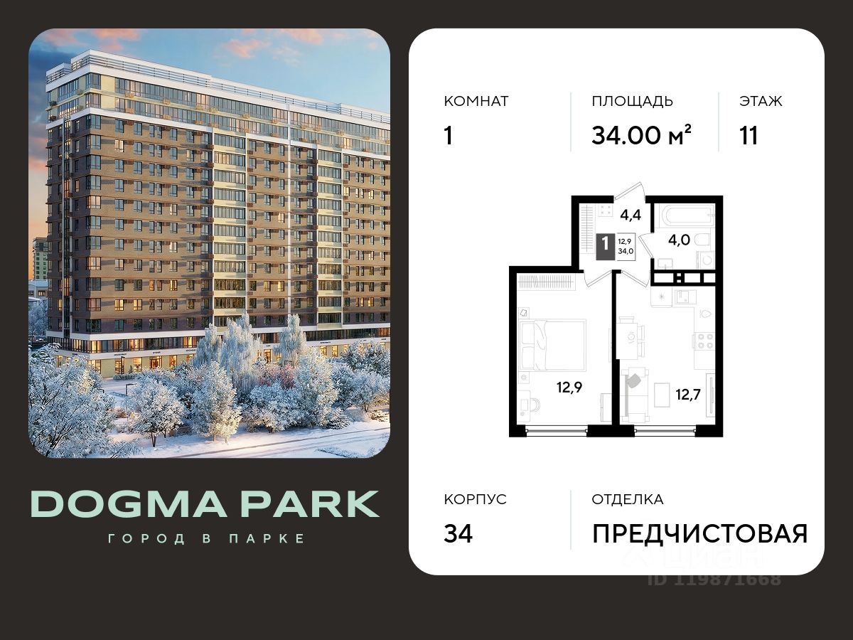 В продаже 1-комнатная квартира от застройщика! Мкр. "ДОГМА ПАРК" г. Краснодар, Литер 34 Срок сдачи: 2 кв. 2027, общей площадью 34.00 кв.м., на 11 этаже.