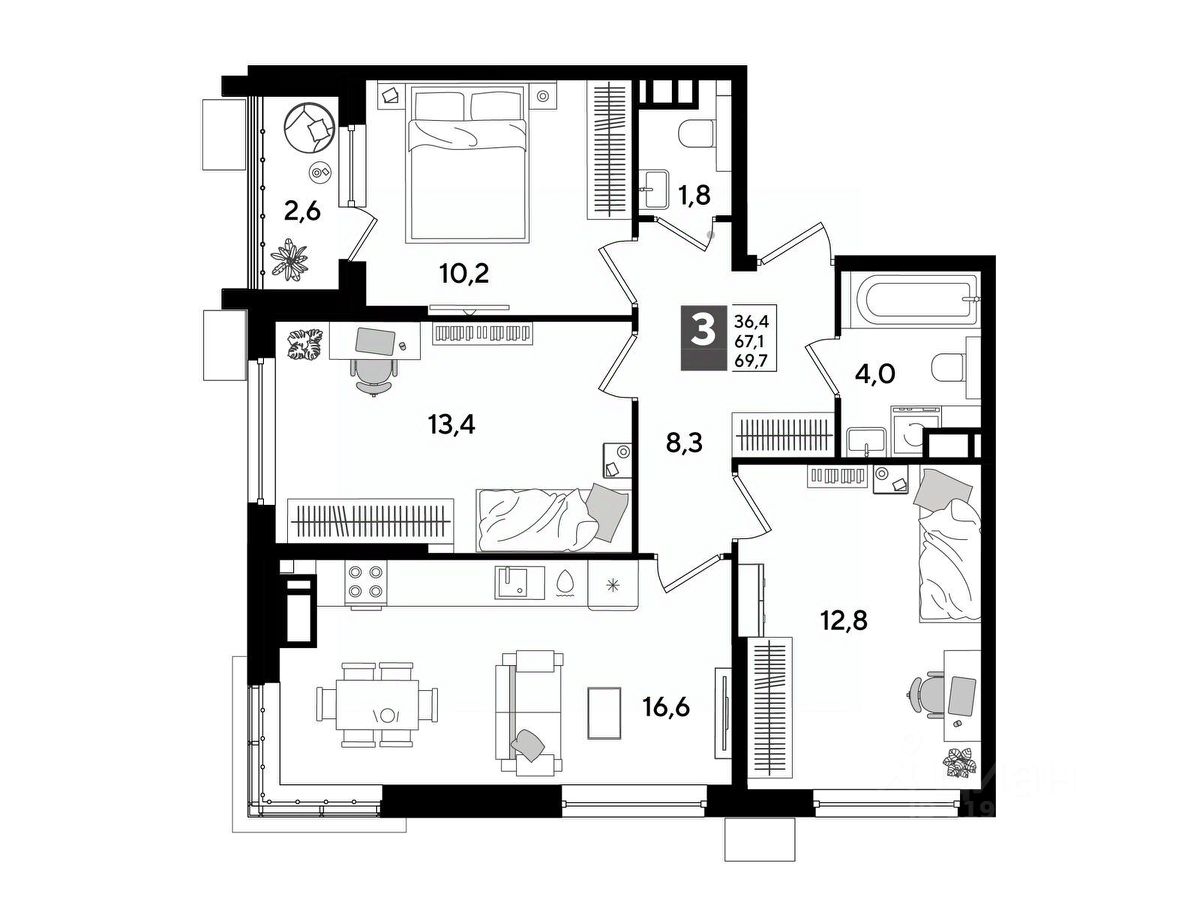В продаже 3-комнатная квартира от застройщика! Мкр. "DOGMA PARK" г. Краснодар, Литер 34 Срок сдачи: 4 кв. 2027, общей площадью 69.7 кв.м., на 16 этаже.