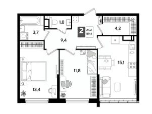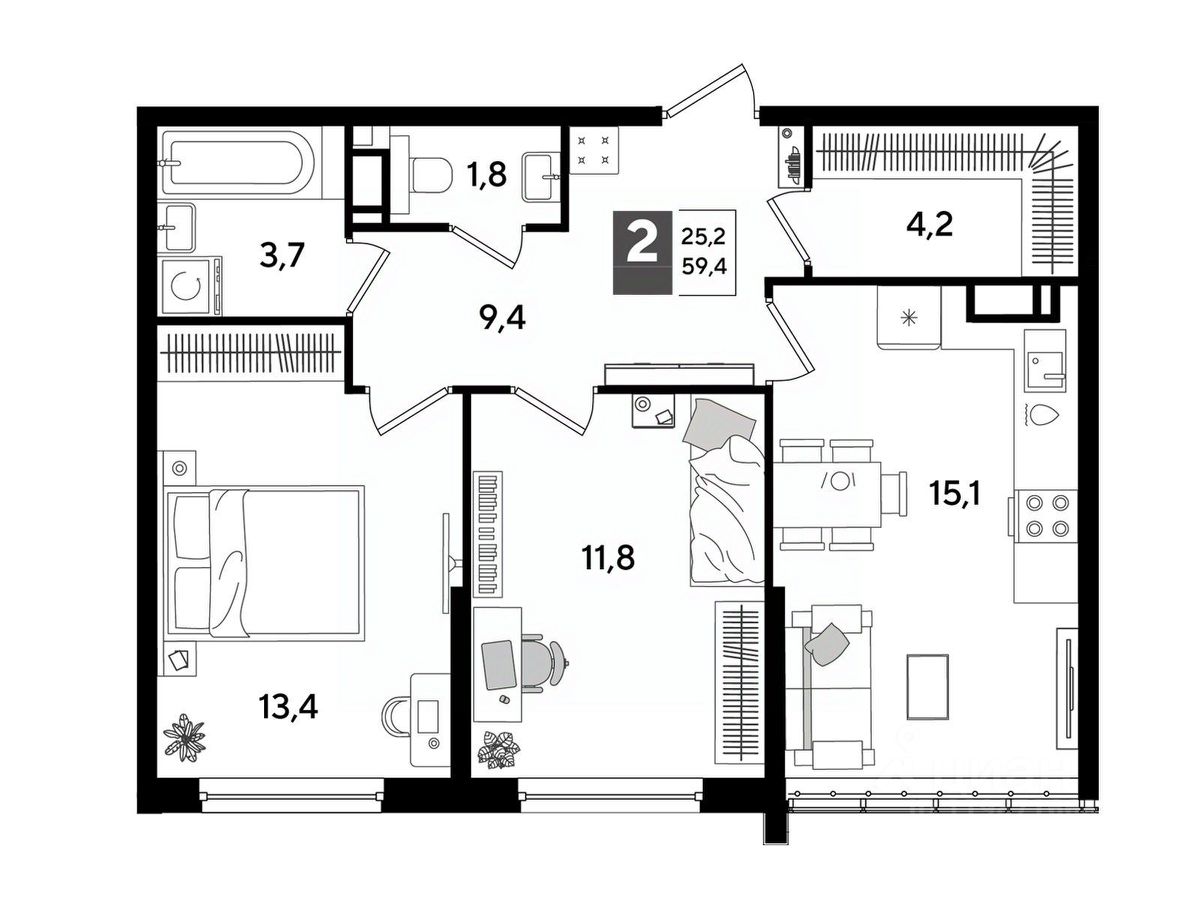 В продаже 2-комнатная квартира от застройщика! Мкр. "DOGMA PARK" г. Краснодар, Литер 34 Срок сдачи: 4 кв. 2027, общей площадью 59.4 кв.м., на 14 этаже.