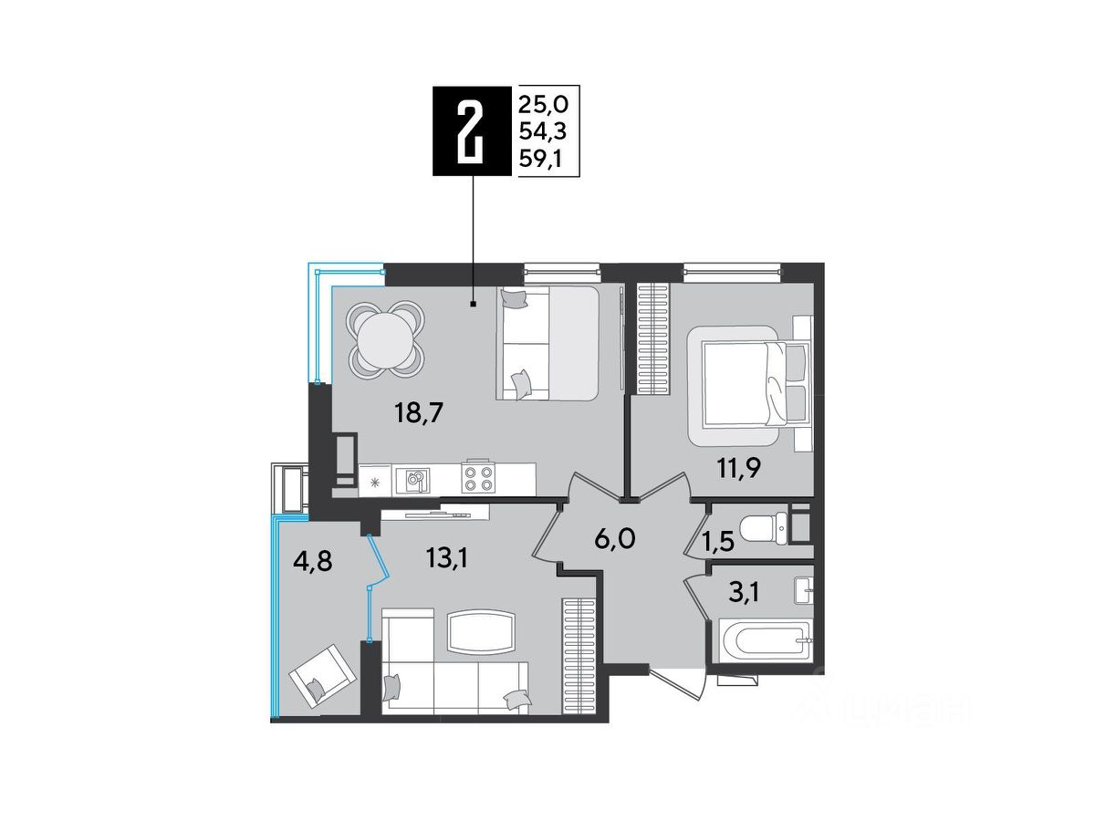 Срок сдачи: 2 кв. 2026, общей площадью 59.1 кв.м., на 15 этаже.