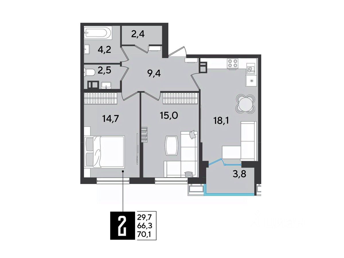 Срок сдачи: 2 кв. 2026, общей площадью 70.1 кв.м., на 8 этаже.