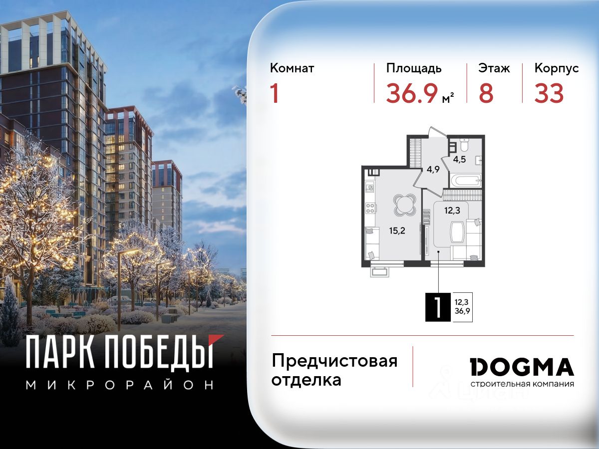 Срок сдачи: 2 кв. 2026, общей площадью 36.9 кв.м., на 8 этаже.