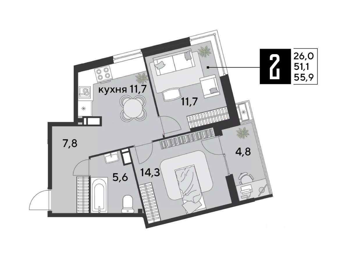 Срок сдачи: 2 кв. 2026, общей площадью 55.9 кв.м., на 10 этаже.