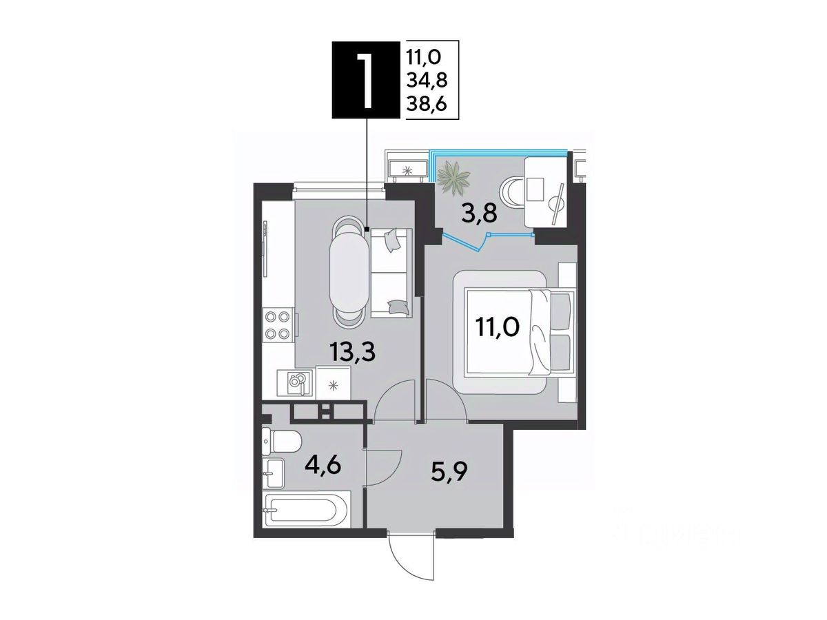 Срок сдачи: 2 кв. 2026, общей площадью 38.6 кв.м., на 10 этаже.