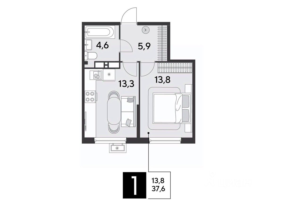 Срок сдачи: 2 кв. 2026, общей площадью 37.6 кв.м., на 15 этаже.