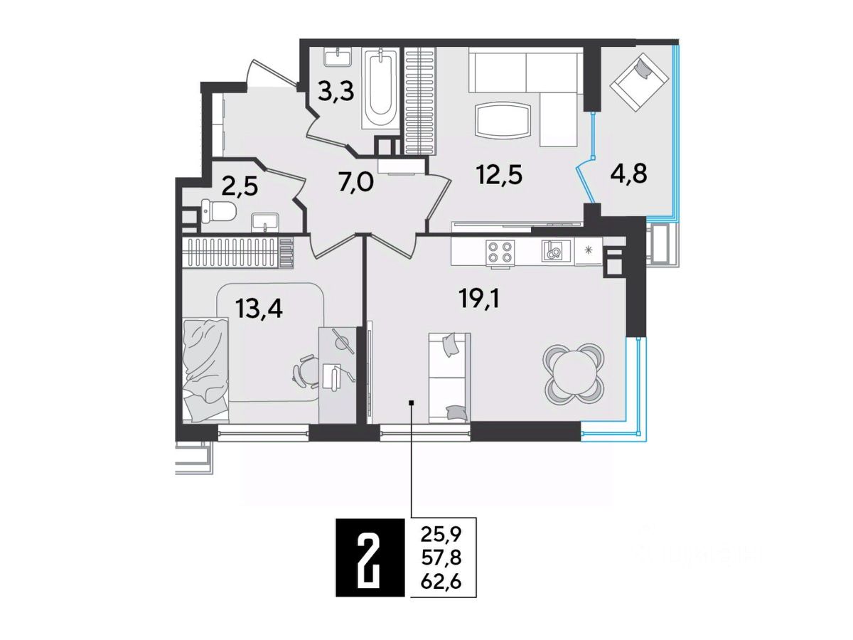 Срок сдачи: 2 кв. 2026, общей площадью 62.6 кв.м., на 7 этаже.