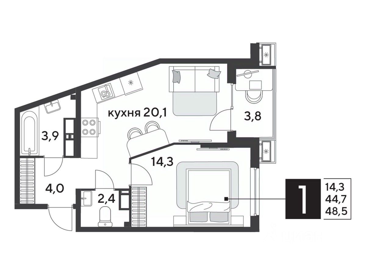 Срок сдачи: 1 кв. 2026, общей площадью 48.5 кв.м., на 16 этаже.