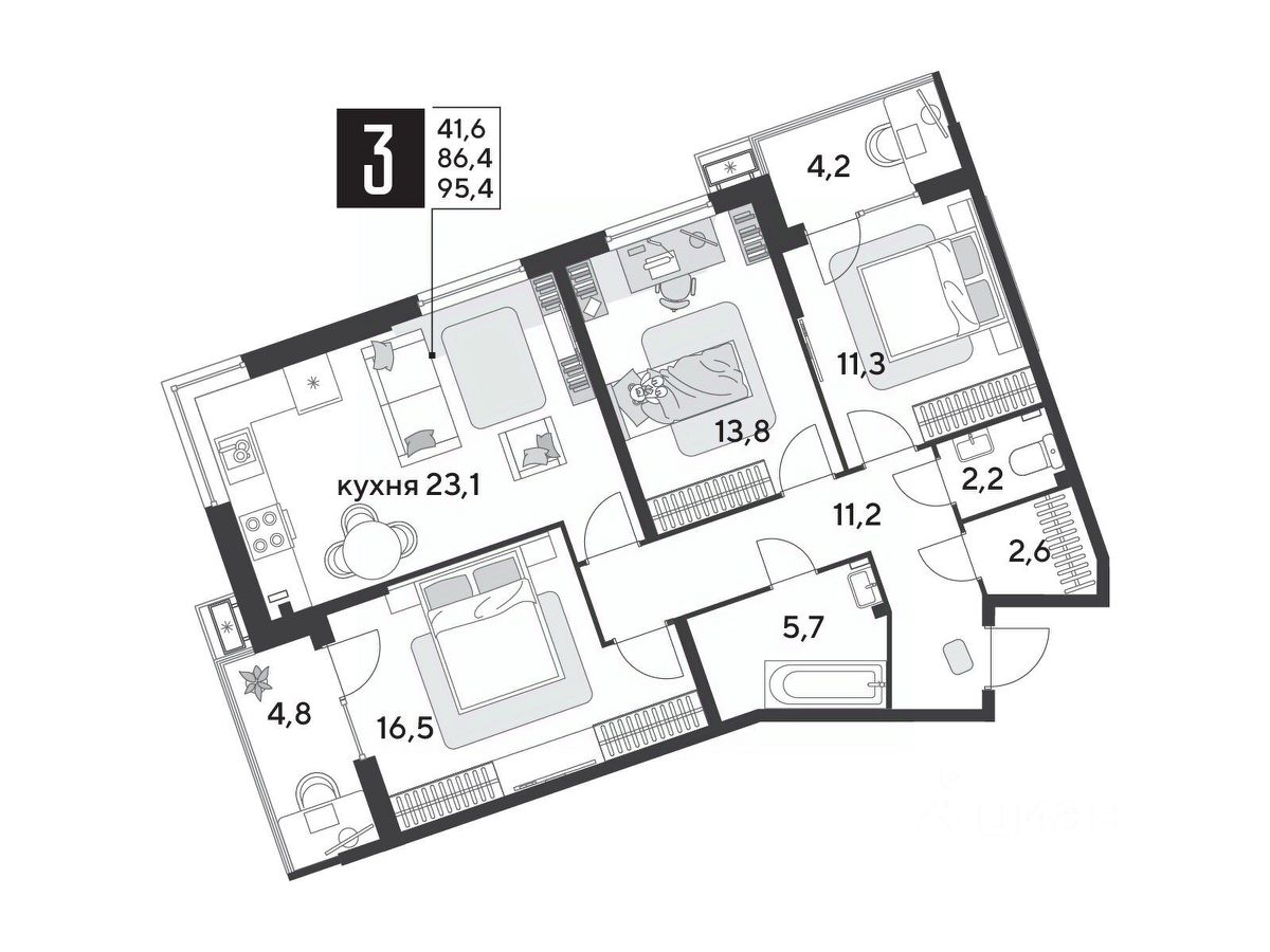 Срок сдачи: 1 кв. 2026, общей площадью 95.4 кв.м., на 2 этаже.