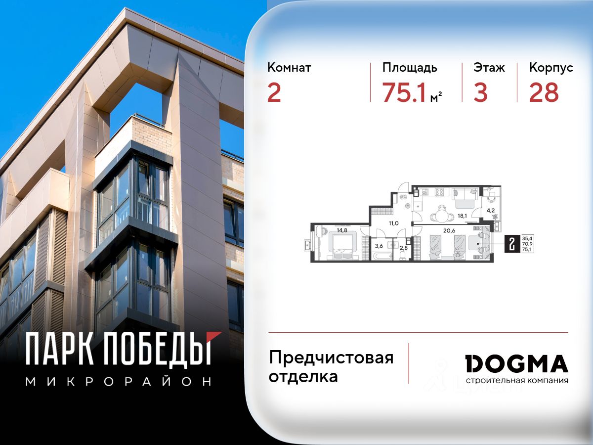 Срок сдачи: 4 кв. 2025, общей площадью 75.1 кв.м., на 3 этаже.