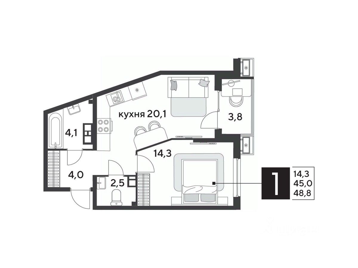 Срок сдачи: 1 кв. 2026, общей площадью 48.8 кв.м., на 5 этаже.