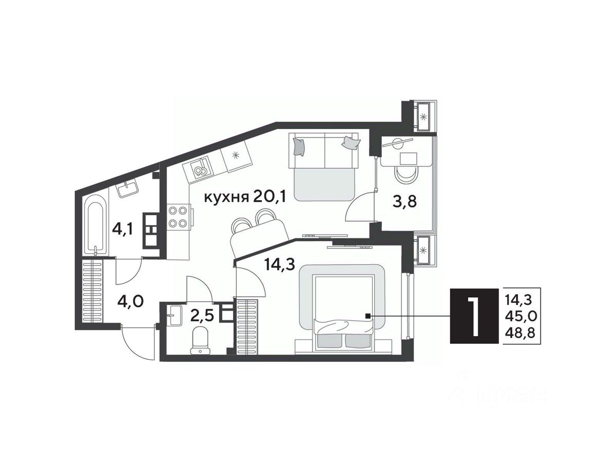 Срок сдачи: 1 кв. 2026, общей площадью 48.8 кв.м., на 6 этаже.